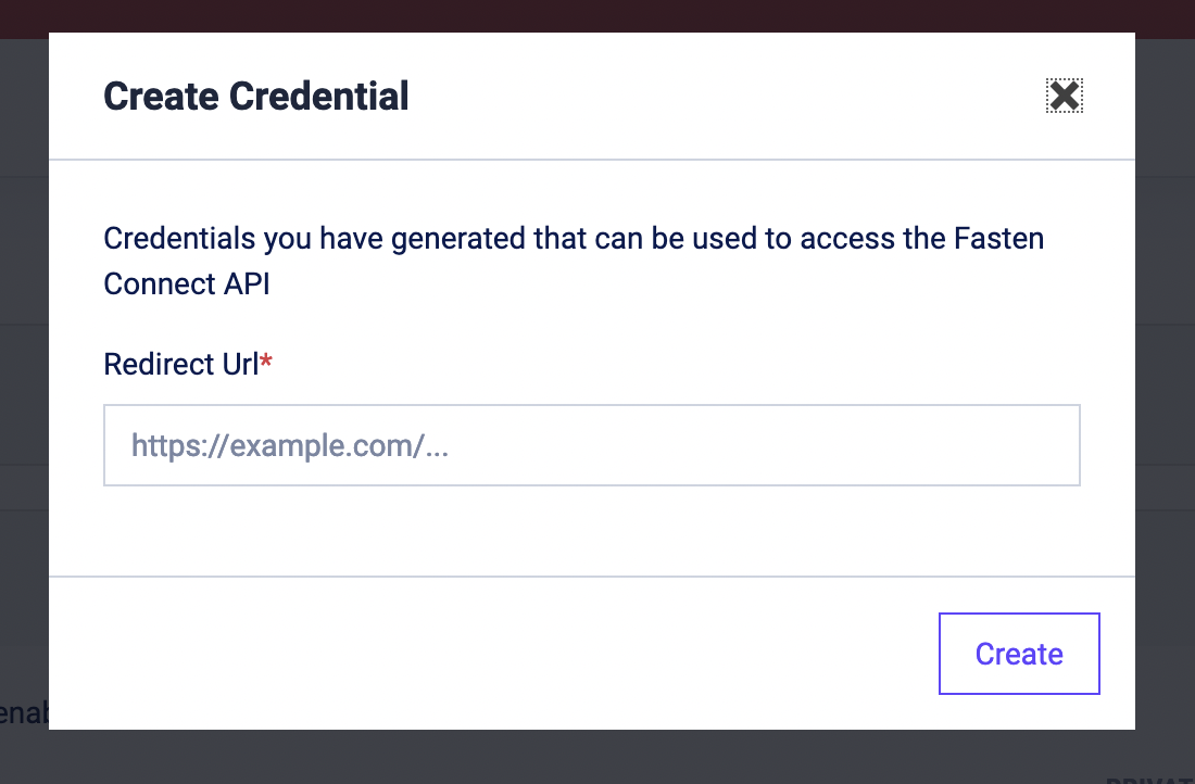 Create Credentialsbutton. You must provide aRedirect URL, which is the URL that Fasten Connect will redirect the user to after they have successfully linked their account.