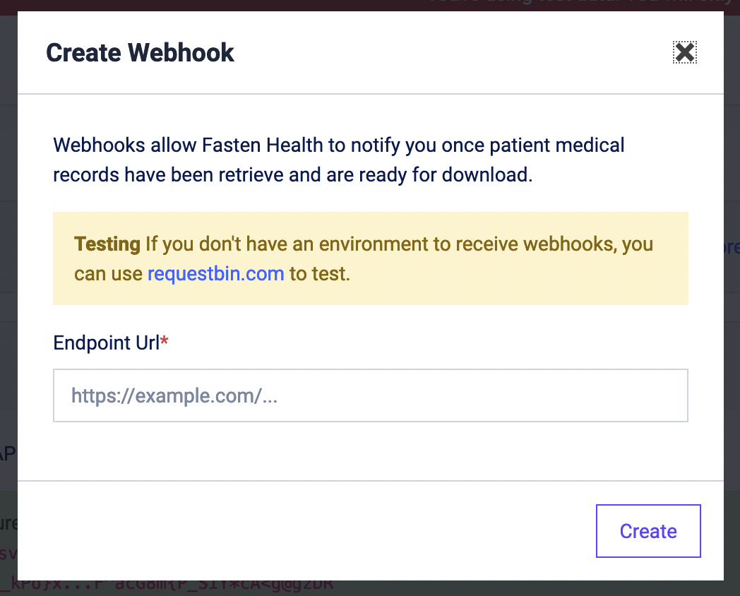 Create Webhookbutton. You must provide aWebhook URL, which is the URL that Fasten Connect will send events to. If you do not have a public URL to use, you can use a service like smee.io or requestbin.com to create a temporary public URL for testing.